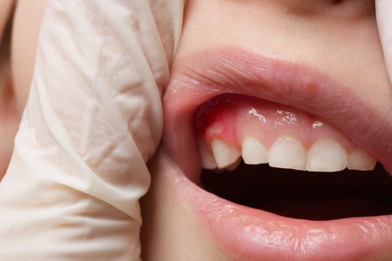 - Отек десны. На десне в проекции корня зуба появляется покрасневшая, отечная, болезненная припухлость. Со временем на ней формируется четко очерченный бугорок с белесоватым содержимым (гноем) — это и есть формирующийся гнойник.